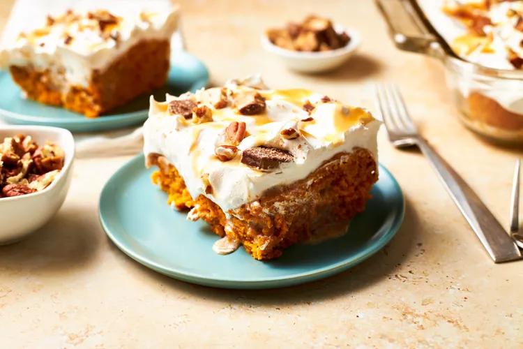 Southern Living Pumpkin Poke Cake cut and ready to serve