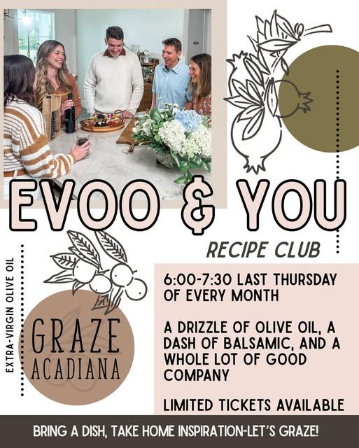 Let’s gather, taste, and get inspired in the kitchen! We’re excited to invite you to EVOO & YOU, a monthly recipe-sharing event at Graze Acadiana. This evening is all about community, creativity, and discovering new ways to enjoy extra virgin olive oils and balsamic vinegars.