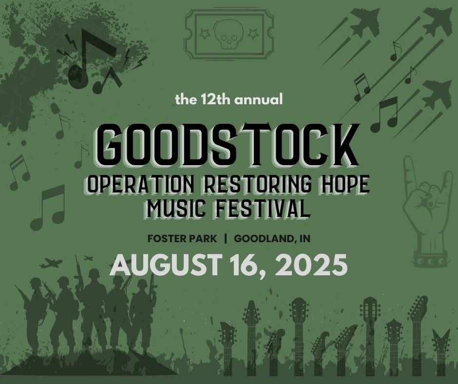 Goodstock – Operation Restoring Hope is Goodland, Indiana’s family-friendly summer music festival supporting local veterans. The day starts with a donation breakfast at 8 AM, followed by a motorcycle flag escort—this year honoring the Air Force flag—before gates open at noon for live music at Foster Park. Tickets are $30 (kids 10 & under free), and every ticket sold helps the Jasper Newton Veterans Assistance Fund. More details on Facebook and our website.