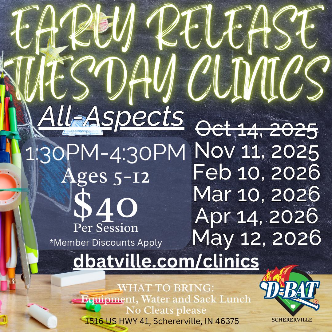 More About Early Release Tuesday Clinics - All-Aspects at D-BAT Schererville (ages 5-12) ⚾