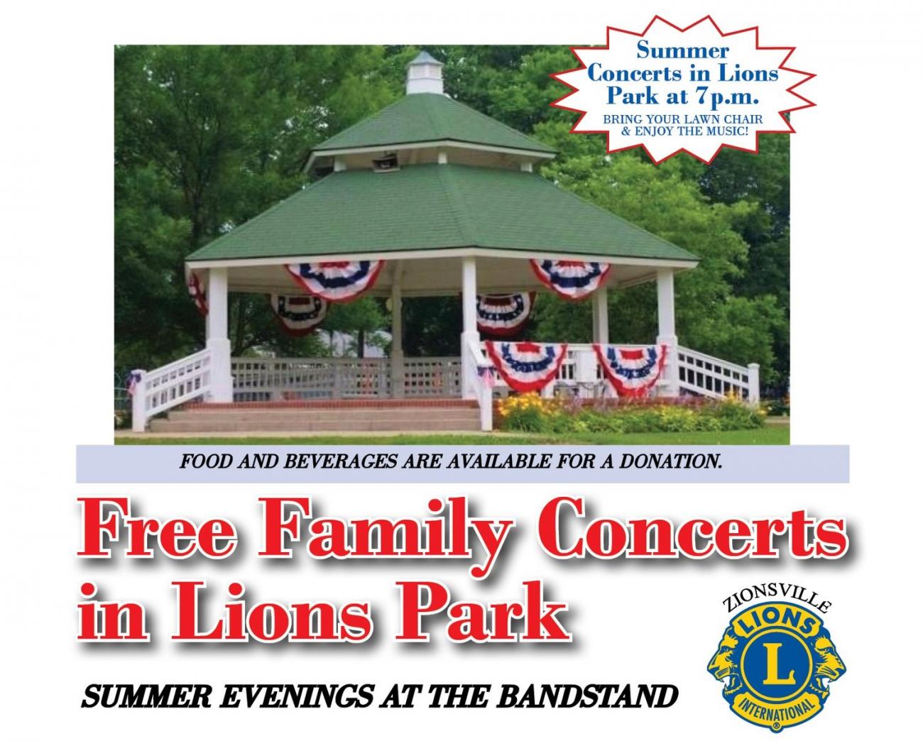 Zionsville Lions Club's Sunday Concert Series is a fun filled night for the entire family. This year's concert dates run from July 5 through August 2, 2026.