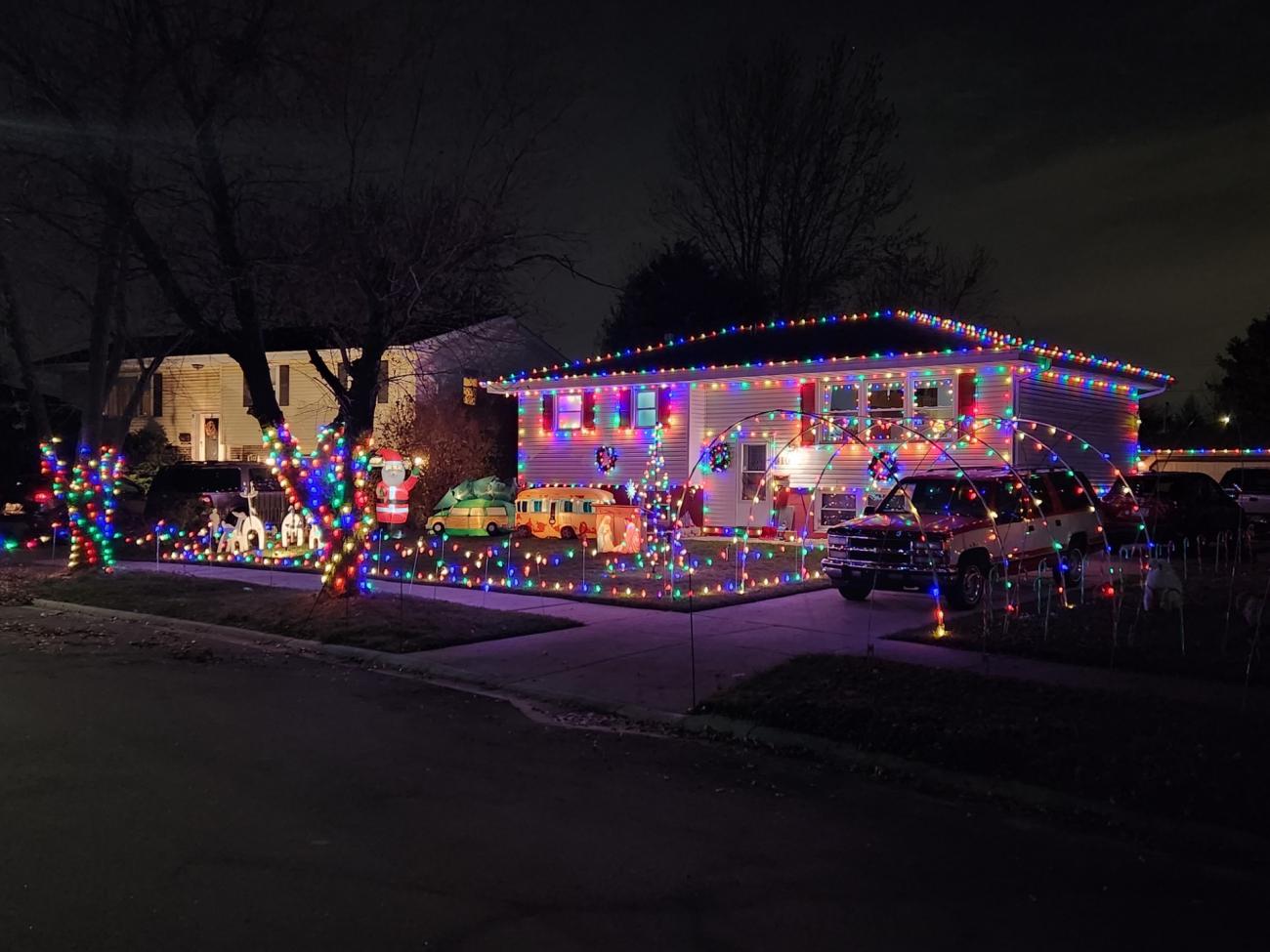 Bi level home decorated with 1500 C7 lightbulbs, including roof, gutters, around front windows, yard perimeter, 5 driveway arches, parkway trees and garage.