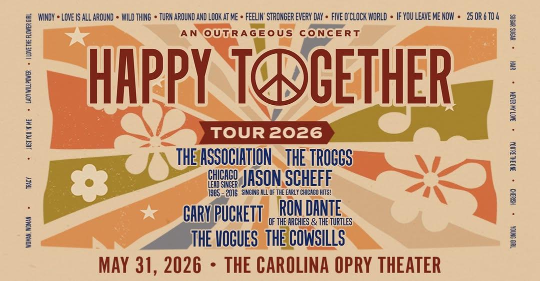 The Happy Together Tour 2026 ft. The Association, The Troggs, Chicago Lead Singer 1985-2016 Jason Scheff, Gary Puckett, Ron Dante from The Archies and The Turtles, The Vogues, and The Cowsills will be live at The Carolina Opry Theater on Sunday, May 31, 2026 at 7:00PM. Tickets are on sale now. To buy tickets visit our website at Click for Details call 800-843-6779 or visit the box office.