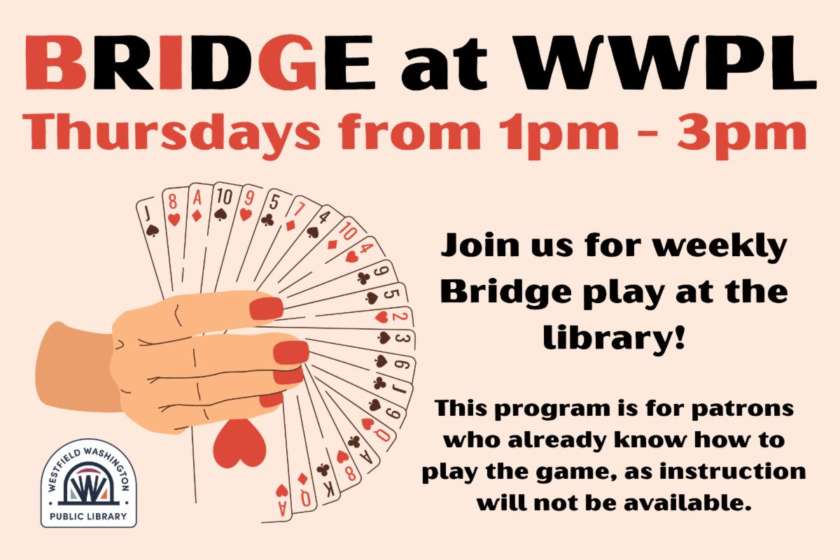 Join us for Bridge play on Thursdays from 1pm to 3pm at the Westfield Washington Public Library. This program is for those who already know how to play. Instruction will not be available.
