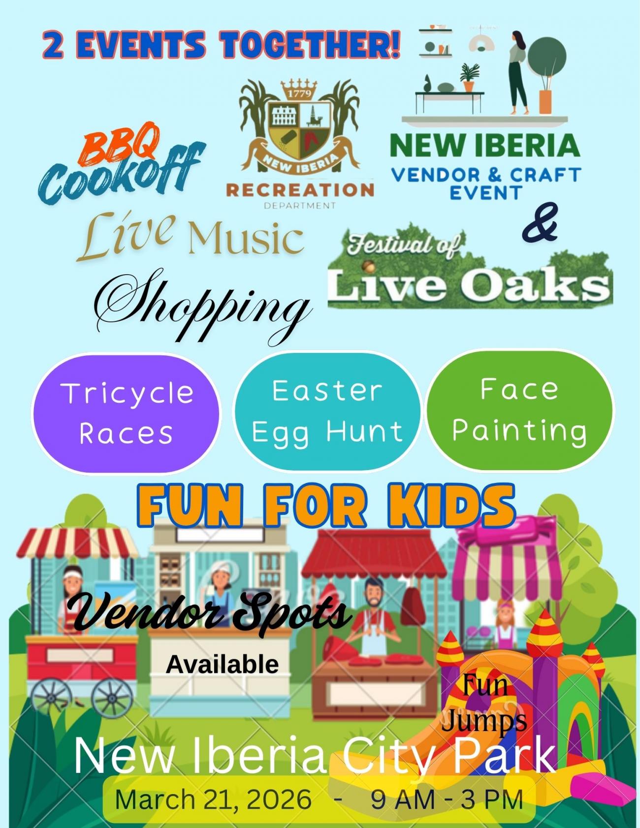 Vendor spots now open for registration! This is a combined event, the New Iberia City Park Vendor and Craft Events and the City Park's Festival of Live Oaks and barbecue cook-off to be held Outdoors at New Iberia City Park March 21. Outdoor spots only, cost is $50 for a 10x10 booth space.