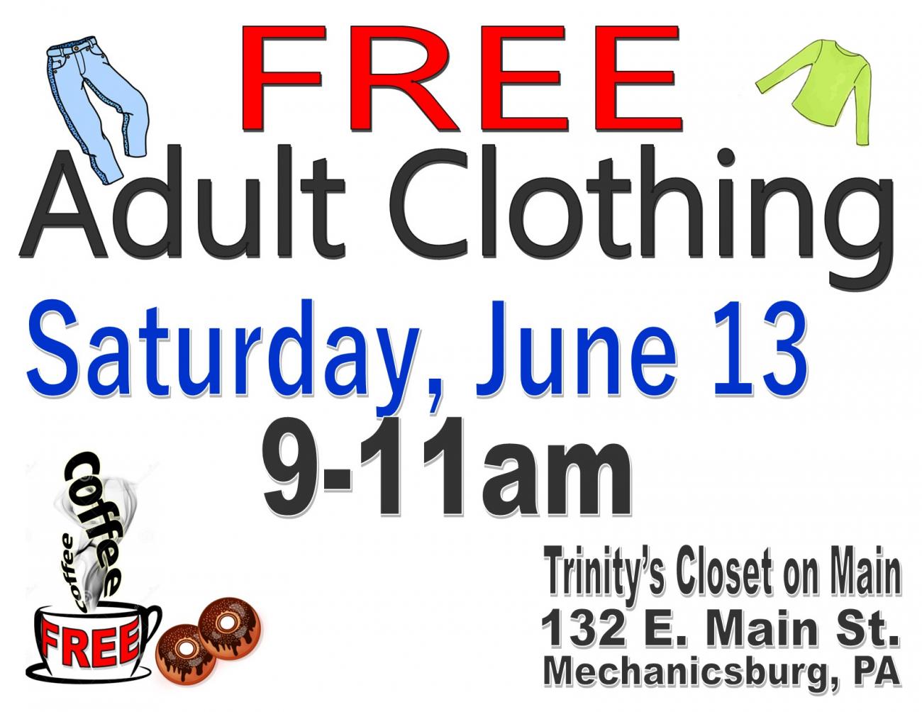Free, seasonal adult clothing in all sizes is offered monthly (except for January). All are invited to come and browse through the selection and take what you can use!