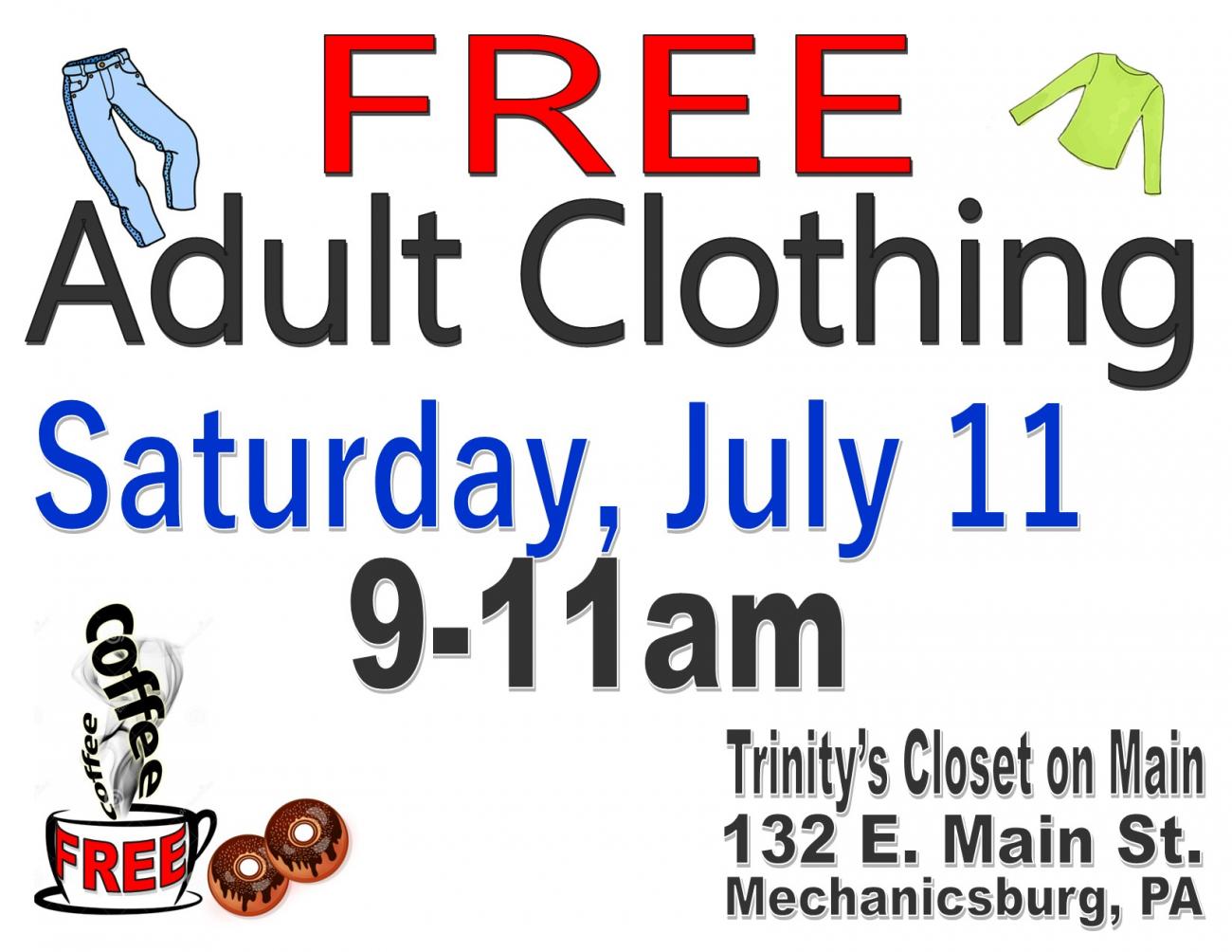 Free, seasonal adult clothing in all sizes is offered monthly (except for January). All are invited to come and browse through the selection and take what you can use!