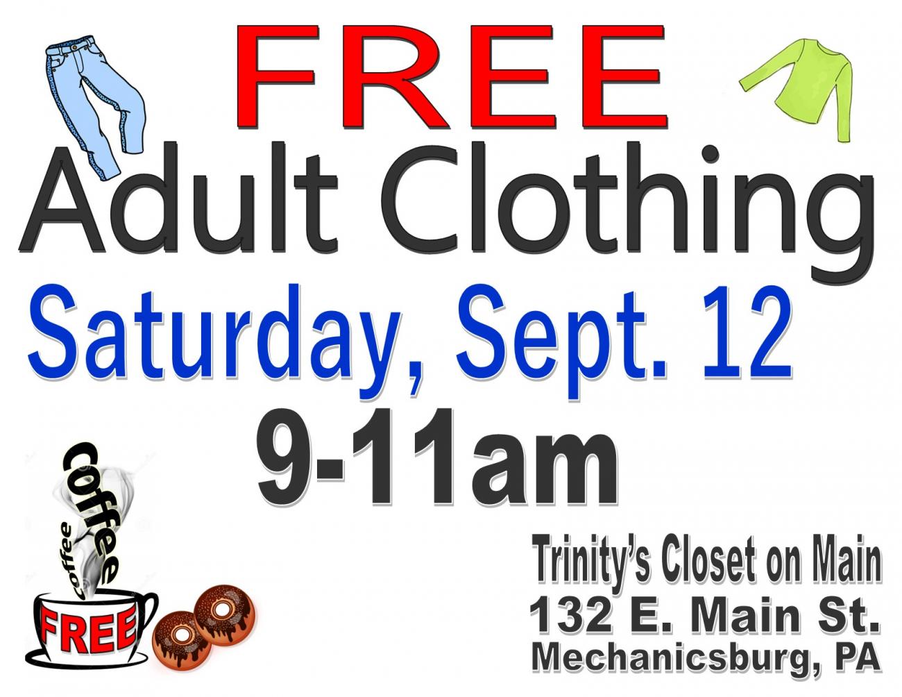 Free, seasonal adult clothing in all sizes is offered monthly (except for January). All are invited to come and browse through the selection and take what you can use!