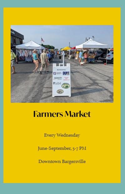 Join us Wednesdays, 5-7 PM, in the heart of downtown Bargersville for fresh, friendly fun, with live music, food trucks, and entertainment! The market is open June-September.