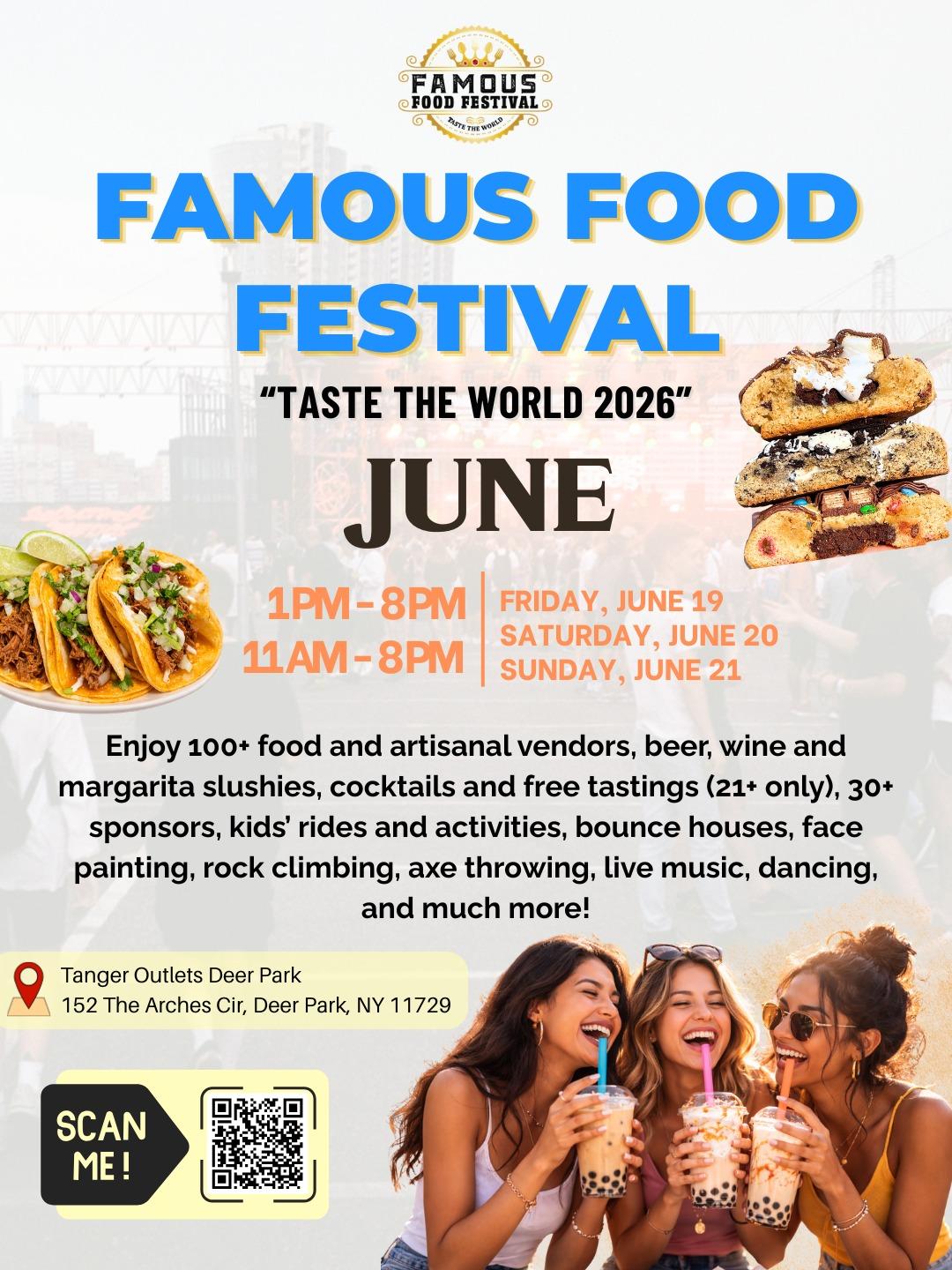 Famous Food Festival returns on June 19th – June 21st, 2026, to the Tanger Outlets in Deer Park, NY! Featuring 100+ vendors serving food from around the world, live music all day, spirit samplings, giveaways, fun games and rides for kids! Come hungry and bring the whole crew—there’s something to taste, sip, and experience around every corner. Tickets are limited, so grab yours now and make it a weekend to remember!