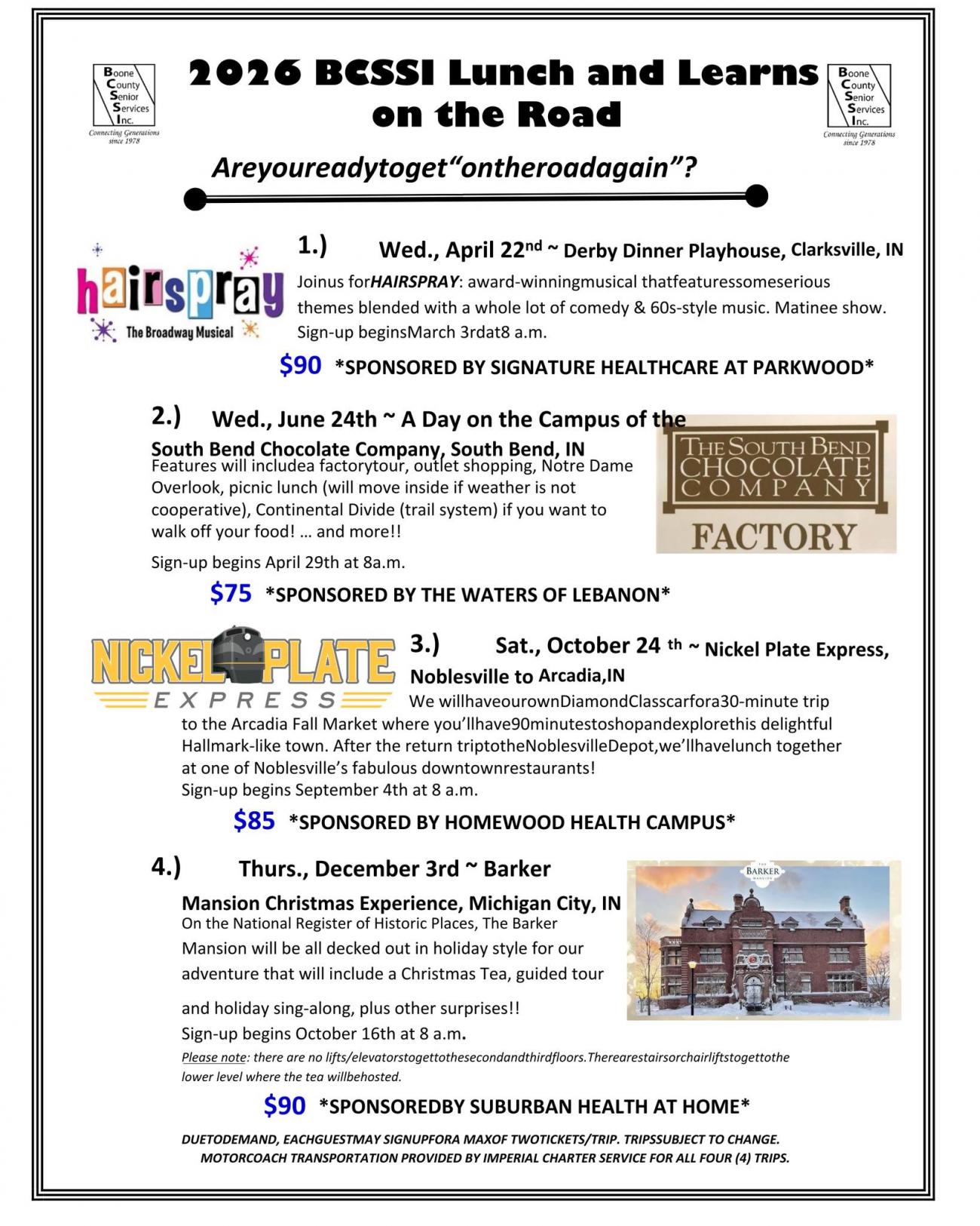 Registration for each lunch and learn trip will begin the day after the proceeding trip. Call 765-482-5220 or 317-873-8939 to register and for more information.