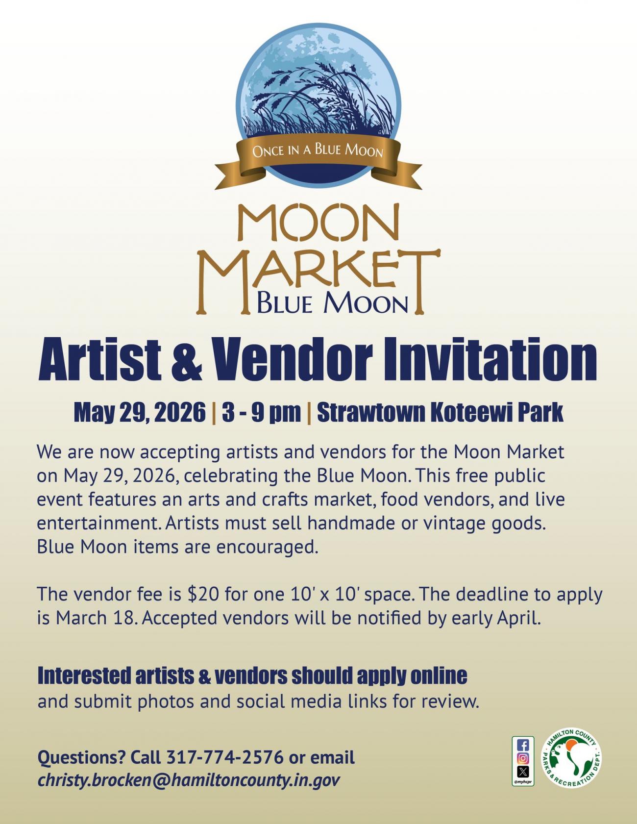 The Moon Market is an arts and craft market taking place at Strawtown Koteewi Park on May 29, 2026, celebrating the Blue Moon. When two full moons happen in the same month, the second full moon is a Blue Moon, and Blue Moons only happen - well, once in a Blue Moon!