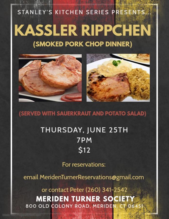 Making a return appearance in the Kitchen Series lineup, Meriden Turner Society presents a Kassler Rippchen (Smoked Pork Chop) Dinner on June 25th. This German favorite will be served with German potato salad and sauerkraut beginning at 7pm and serving until everyone who has made reservations has received their meal. As we always get excellent turnouts for our authentic German dishes, do not wait to make reservations! The price per dinner is $12, and reservations must be made in advance by contacting Peter by email (MeridenTurnerReservations@gmail.com) or phone (260) 341-2542. For more information, visit our website at Click for Details or facebook at Click for Details