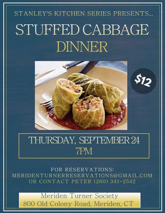 Stanley's Kitchen Series will be serving Stuffed Cabbage Dinners on Thu, September 24th at the Meriden Turner Halle, 800 Old Colony Rd, Meriden, CT. The price per dinner is $12, and reservations are required. Contact Peter at MeridenTurnerReservations@gmail.com or (260) 341-2542. For more information about this event, visit our website at Click for Details or on Facebook at Click for Details