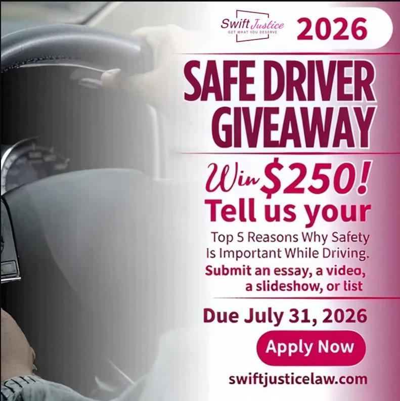 Swift Justice, Inc. invites California high school students to share their Top 5 Reasons Why Driving Safety Matters for a chance to win a $250 Amazon gift card. Submit your essay, video, slideshow, or list by July 31, 2026!