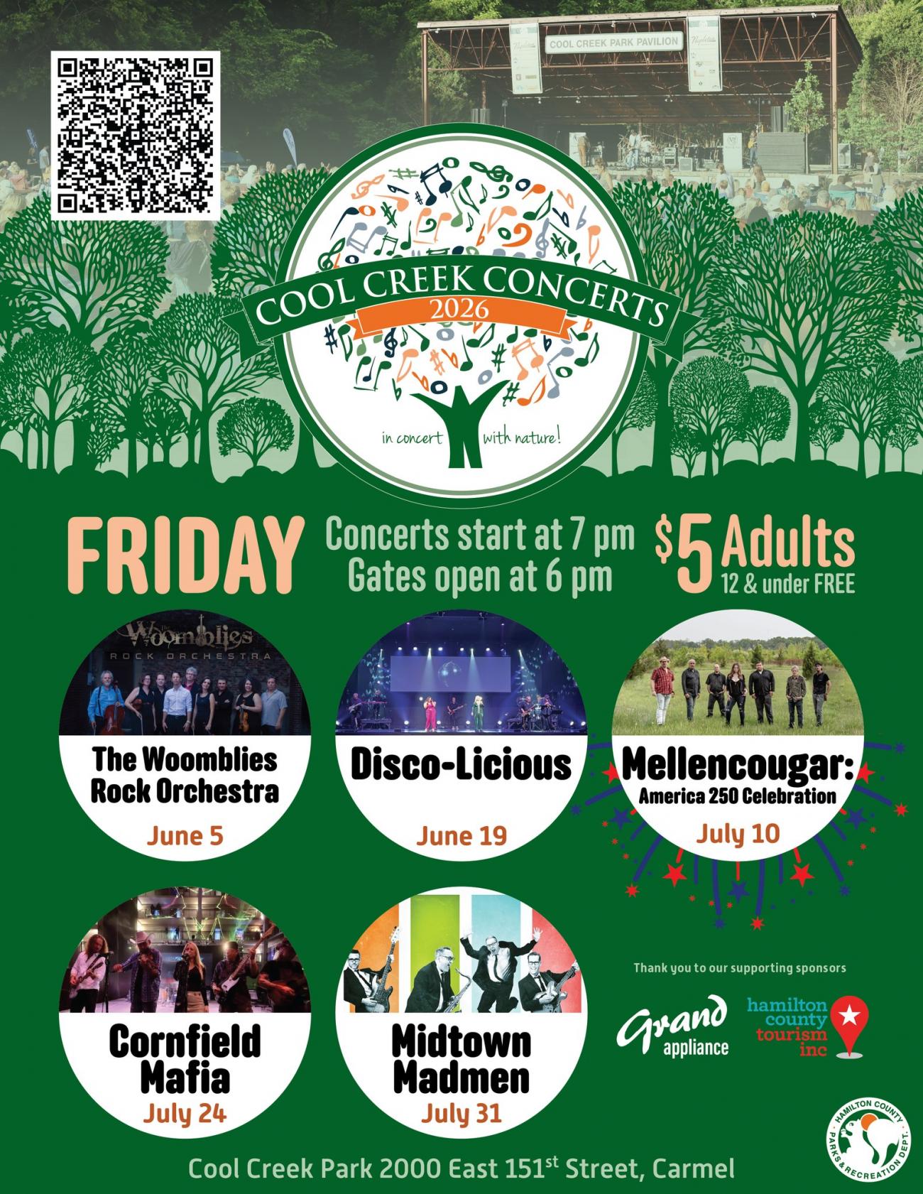 Cool Creek Concerts in concert with nature on select Fridays, June through July this year! Gates open at 6pm; concerts start at 7pm. Kid zone activities, food and drink vendors will be available at all concerts. Outside food and drinks are allowed as well. Don’t forget to bring your lawn chair and/or blankets!