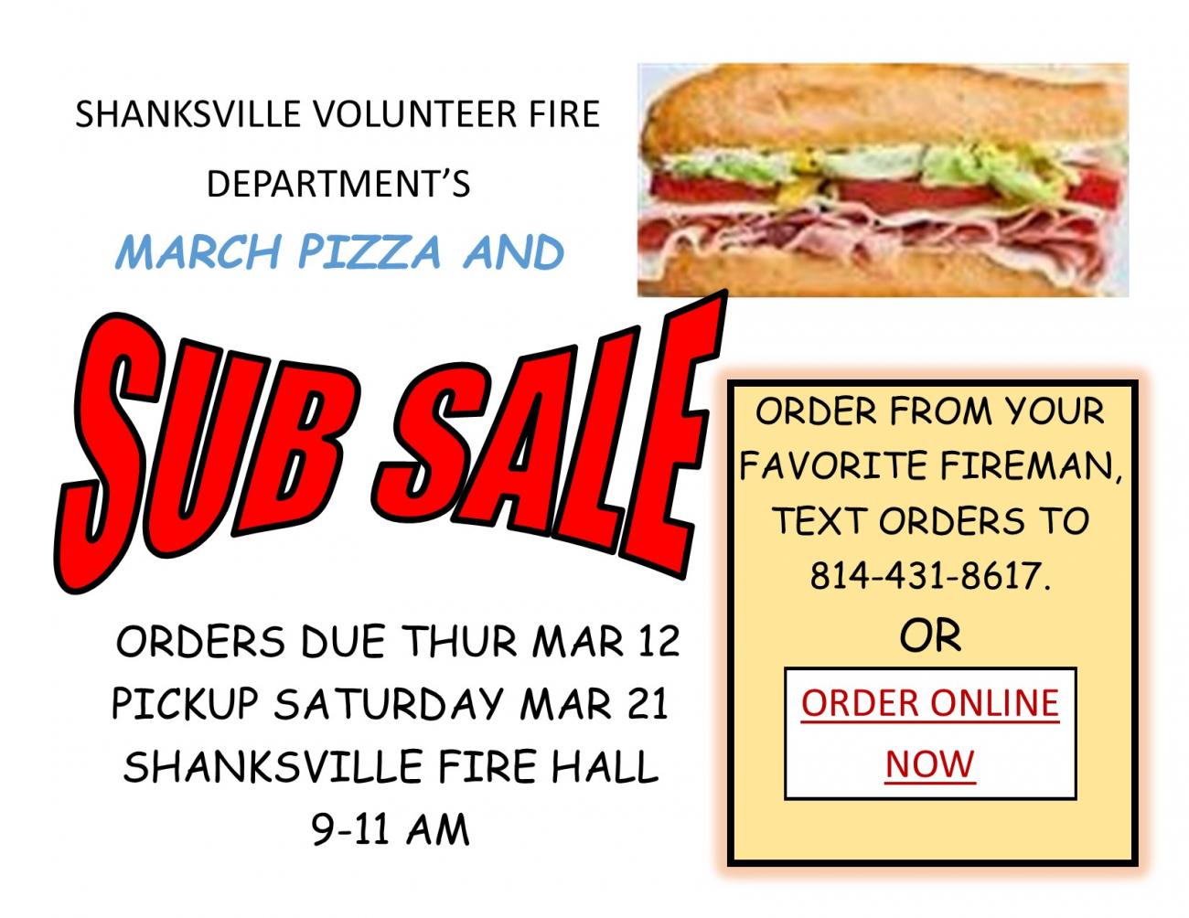 The Shanksville Volunteer Fire Department will hold its third sub and pizza sale of the year on Saturday, March 21st. The department assembles its own 18-inch subs fresh on the morning of the sale. Each sandwich has three meats, (ham, salami, and bologna), two cheeses, (American and Provolone), with or without onions, on a freshly-baked bun, plus lettuce, tomato and pickles packed separately so the sandwiches never get soggy. Subs cost $12.00 and 12β pizzas, fresh-made by Kovals, are $10.00 with or without pepperoni. Orders are due the week before the sale, Thursday, March 12th. Place orders online at shanksvillevfd.org/coming-events, Stonycreek Builders Supply, from any SVFD member, or text to 814-431-8617. Pick up orders at the Shanksville Fire Hall, 625 North Street, Shanksville, between 9AM and 11AM on March 21st.