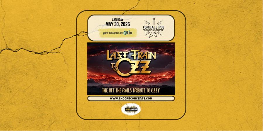 The Tonidale Pub and Encore Concerts proudly present Last Train to Ozz - The Off the Rails Tribute to Ozzy - live in concert on Saturday, May 30, 2026. Doors open at 6:30 PM and the show starts at 8:00 PM. Advance tickets are available now at Etix.com or via the link on this listing. Any remaining tickets will be available for purchase at the door on the day of the show, beginning at the time of entry. Cash and most electronic forms of payment are accepted at this venue. Seating is available on a first-come, first-served basis beginning at the time of entry. No reservations will be accepted for this event. This event is for ages 21 and over only. Valid identification is required for entry. Free parking is available to attendees in the venue's parking lot. All sales are final. No refunds, exchanges, or transfers unless the event is canceled, postponed, or rescheduled.