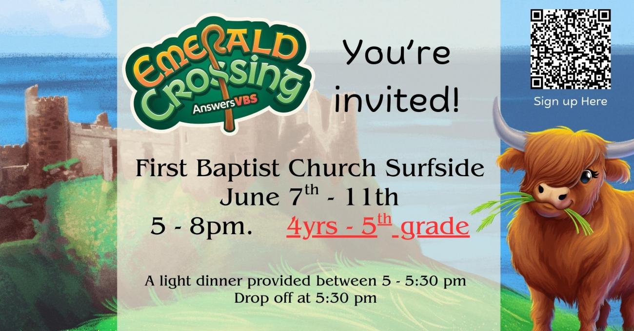 In a world filled with worry and confusion, kids need to know there is a God who cares for them. At Emerald Crossing VBS, they'll journey through Ireland's lush landscapes, exploring the powerful words of Psalm 23. They'll discover the life of the shepherd-king David and will learn how to cross from worry to peace, from fear to faith, and from uncertainty to a firm foundation in God's work through a relationship with the Good Shepherd. Get your passport ready for Ireland and join the adventure.Join us for Bible School for ages 4 years through 5th grade from June 7th - June 11th, 5:00 - 8:00 pm. A light dinner provided between 5:00 - 5:30.