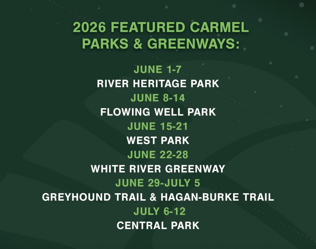 Each week, explore one of Carmel’s parks, one trail at a time. Whether you’re a runner or walker looking for a new fitness challenge, or you simply enjoy a good stroll through the park, this is your chance to discover new spots and support your local parks—all at your own pace! Complete and record your days, times and distance on all eight featured trails, and you’ll be entered to win some fantastic prizes from local businesses!