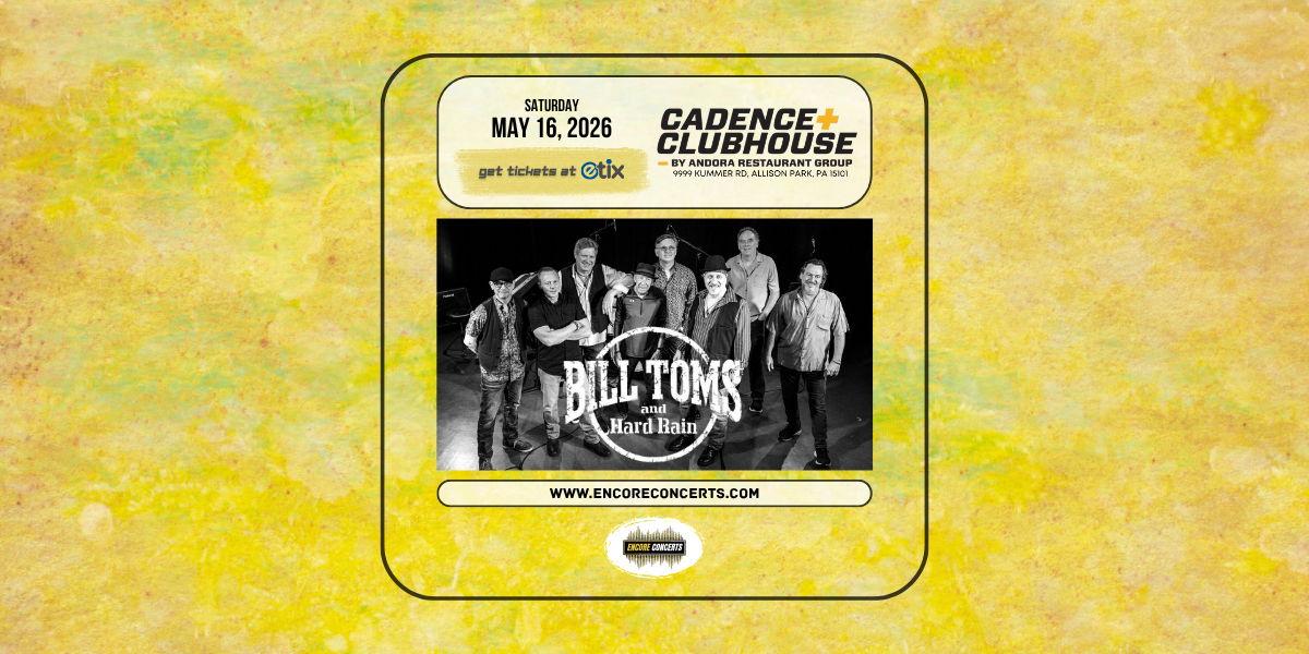 Cadence Clubhouse and Encore Concerts proudly present Bill Toms & Hard Rain - Americana Rock & Soul - live in concert on Saturday, May 16, 2026. Event entry begins at 6:00 PM and the show starts at 7:00 PM. Advance tickets are available now at Etix.com or via the link on this listing. Any remaining tickets will be available for purchase at the door on the day of the show, starting at the time of entry. Cash and most electronic forms of payment are accepted at this venue. Seating is available on a first-come, first-served basis starting at the time of entry. No reservations will be accepted for this event. This event is open to all ages. Valid identification is required to purchase or consume alcohol. Free parking is available to attendees in the venue's parking lot. This event will be held indoors. All sales are final. No refunds, exchanges, or transfers unless the event is canceled, postponed, or rescheduled.