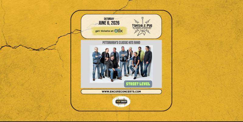 The Tonidale Pub and Encore Concerts proudly present Street Level - Pittsburgh's Classic Hits Band - live in concert on Saturday, June 6, 2026. Doors open at 6:30 PM and the show starts at 8:00 PM. Advance tickets are available now at Etix.com or via the link on this listing. Any remaining tickets will be available for purchase at the door on the day of the show, beginning at the time of entry. Cash and most electronic forms of payment are accepted at this venue. Seating is available on a first-come, first-served basis beginning at the time of entry. No reservations will be accepted for this event. This event is for ages 21 and over only. Valid identification is required for entry. Free parking is available to attendees in the venue's parking lot. All sales are final. No refunds, exchanges, or transfers unless the event is canceled, postponed, or rescheduled.