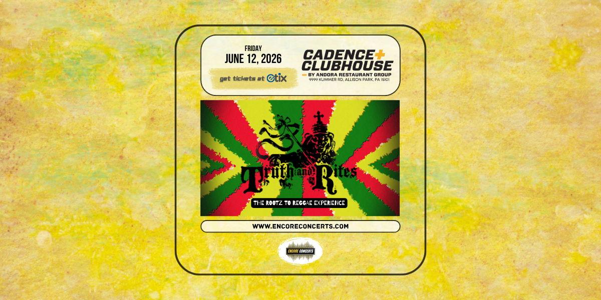 Cadence Clubhouse and Encore Concerts proudly present Truth & Rites - The Rootz to Reggae Experience - live in concert on Friday, June 12, 2026. Event entry begins at 6:00 PM and the show starts at 7:00 PM. Advance tickets are available now at Etix.com or via the link on this listing. Any remaining tickets will be available for purchase at the door on the day of the show, starting at the time of entry. Cash and most electronic forms of payment are accepted at this venue. Seating is available on a first-come, first-served basis starting at the time of entry. No reservations will be accepted for this event. This event is open to all ages. Valid identification is required to purchase or consume alcohol. Free parking is available to attendees in the venue's parking lot. This event will be held outdoors. If inclement weather occurs, the performance will move indoors, if possible. All sales are final. No refunds, exchanges, or transfers unless the event is canceled, postponed, or rescheduled.