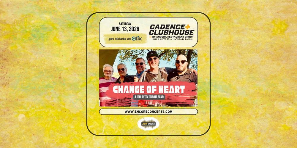 Cadence Clubhouse and Encore Concerts proudly present Change of Heart - A Tom Petty Tribute Band - live in concert on Saturday, June 13, 2026. Event entry begins at 6:00 PM and the show starts at 7:00 PM. Advance tickets are available now at Etix.com or via the link on this listing. Any remaining tickets will be available for purchase at the door on the day of the show, starting at the time of entry. Cash and most electronic forms of payment are accepted at this venue. Seating is available on a first-come, first-served basis starting at the time of entry. No reservations will be accepted for this event. This event is open to all ages. Valid identification is required to purchase or consume alcohol. Free parking is available to attendees in the venue's parking lot. This event will be held outdoors. If inclement weather occurs, the performance will move indoors, if possible. All sales are final. No refunds, exchanges, or transfers unless the event is canceled, postponed, or rescheduled.