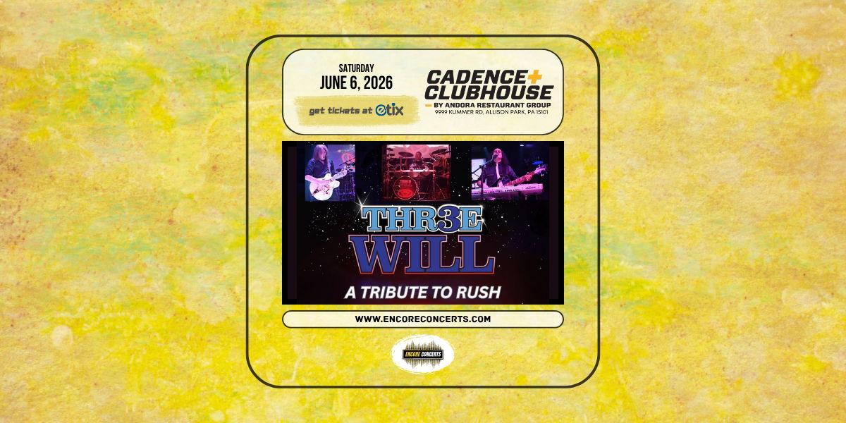 Cadence Clubhouse and Encore Concerts proudly present THR3EWILL - A Tribute to Rush - live in concert on Saturday, June 6, 2026. Event entry begins at 6:00 PM and the show starts at 7:00 PM. Advance tickets are available now at Etix.com or via the link on this listing. Any remaining tickets will be available for purchase at the door on the day of the show, starting at the time of entry. Cash and most electronic forms of payment are accepted at this venue. Seating is available on a first-come, first-served basis starting at the time of entry. No reservations will be accepted for this event. This event is open to all ages. Valid identification is required to purchase or consume alcohol. Free parking is available to attendees in the venue's parking lot. This event will be held outdoors. If inclement weather occurs, the performance will move indoors, if possible. All sales are final. No refunds, exchanges, or transfers unless the event is canceled, postponed, or rescheduled.