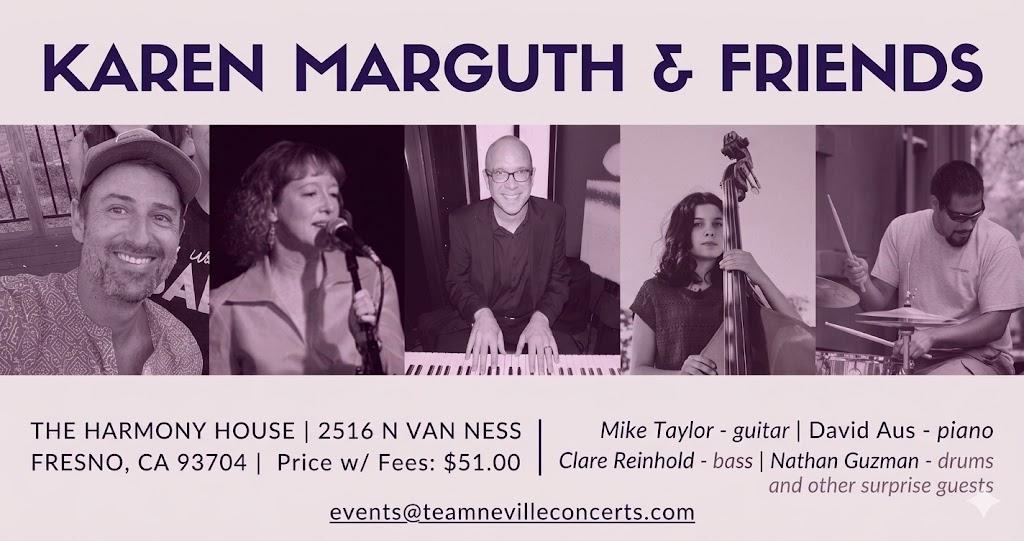 TeamNeville Concerts presents Bay Area jazz vocalist Karen Marguth and some of her best friends on May 28 at The Harmony House on Van Ness, 2516 N Van Ness, Fresno, 7:30 pm show, 7 pm doors, all ages, GA seating. Tickets include dessert and soft drinks. You may bring your own wine.