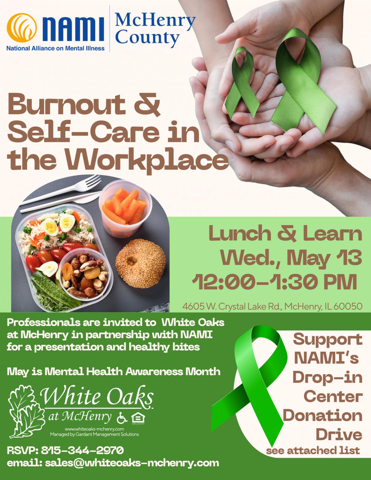 May is mental health awareness month and White Oaks invites professional partners to join us for this presentation by NAMI: Burnout and Self-Care in the Workplace. Lunch is included at this free event, but please RSVP. Guests are encouraged to participate in the Donation Drive for the Drop-in Center at NAMI in Crystal Lake. RSVP to Debora 815-344-2970 or email sales@whiteoaks-mchenry.com