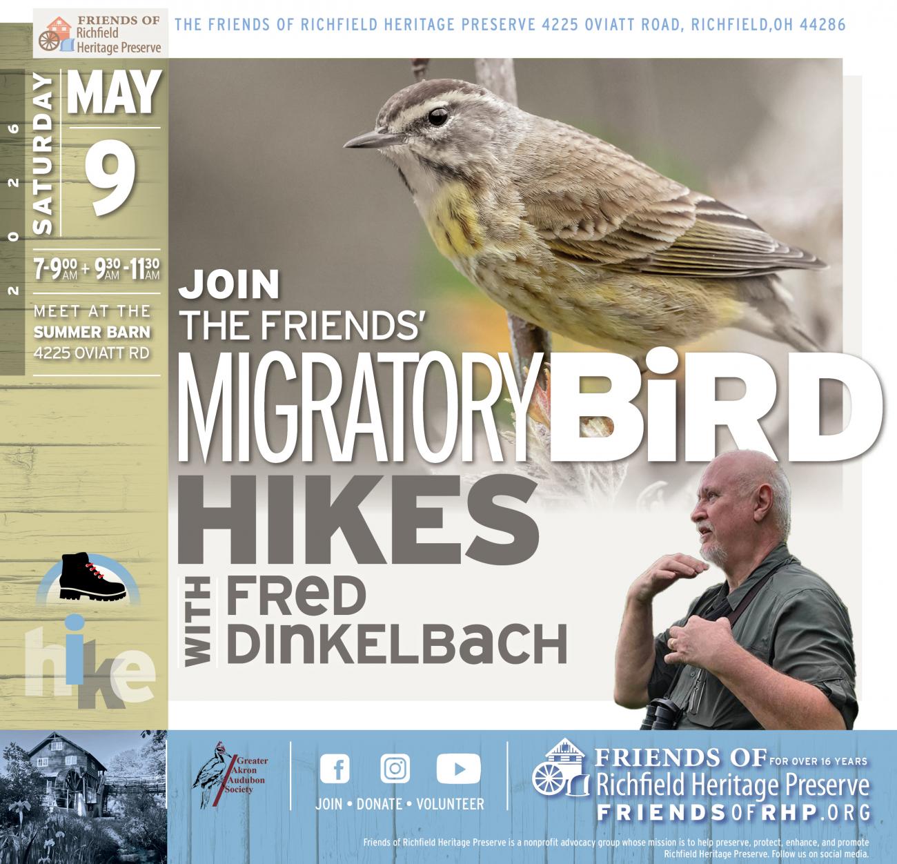The Friends of Richfield Heritage Preserve (Friends) will offer two migratory bird hikes on Saturday, May 9, 2026, 7:00-9:00 a.m. and 9:30-11:30 a.m., at Richfield Heritage Preserve. Attendees will meet by the Summer Barn (4225 Oviatt Road park entrance). Professional birder Fred Dinkelbach will review some basic birding skills and then lead attendees on a 1-1/2 mile hike, along woodland trails and gravel roads, through the different park habitats – listening and looking for our feathered friends in the height of their spring migration.