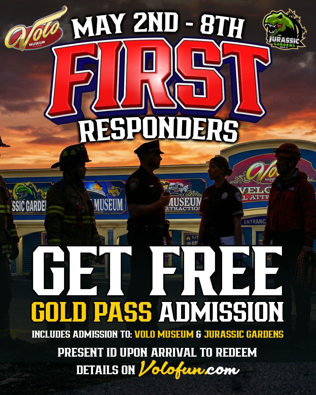 Your Gold Pass includes: Admission to both the Volo Museum and Jurassic Gardens — a full day of fun and adventure for those who give so much to keep us safe.