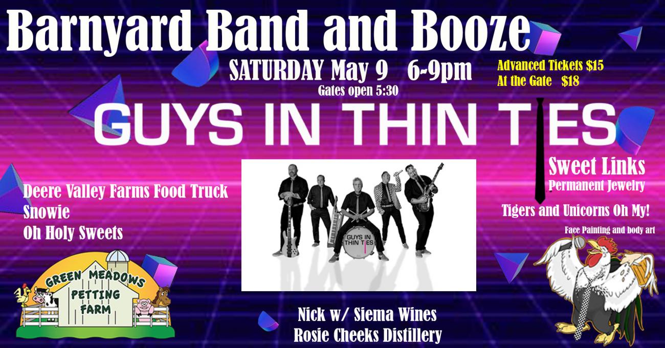 On Saturday May 9 the farm is open for our FIRST evening concert (rain or shine) of the season. Our featured band, Guys In Thin Ties, will begin playing at 6pm. We will also have various breweries, distilleries, wineries, food and more. Enjoy an adult beverage purchased from one of our vendors. The Animal Barn will also be open. Bring your blankets, chairs & friends. Come join us for a fun evening on our farm. Children are welcome. Visit our website (Click for Details) for more information and the latest updates.