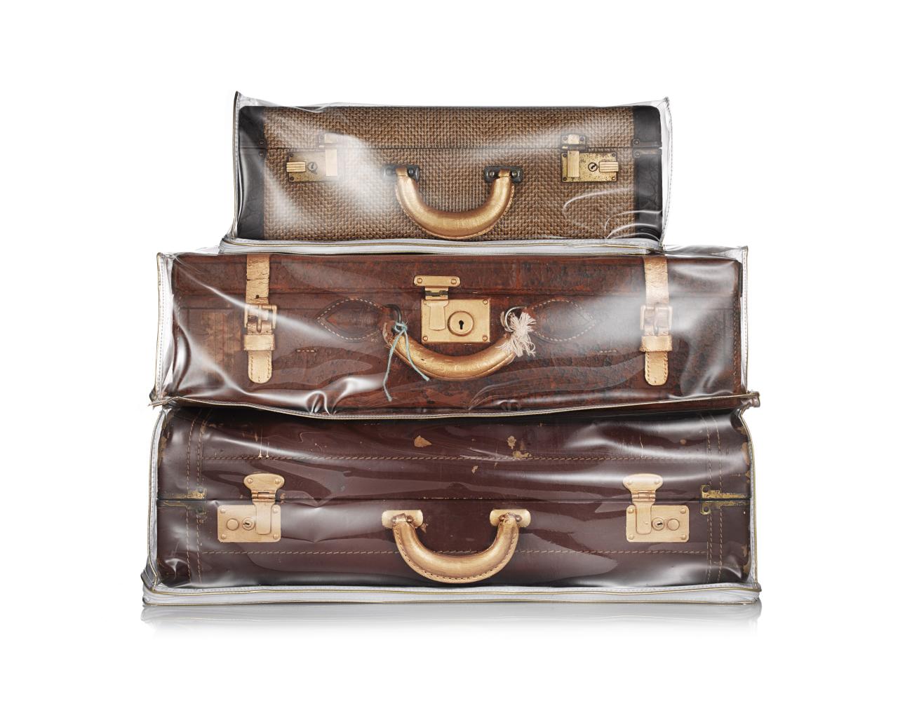 Cheryl R. Riley’s Transcendence Preserved presents everyday objects as tributes to her ancestors’ ability to survive, thrive, and even excel. Vintage luggage, a record player, and a rotary telephone are sealed in custom vinyl slipcovers and accented with gold paint marking the places where hands once