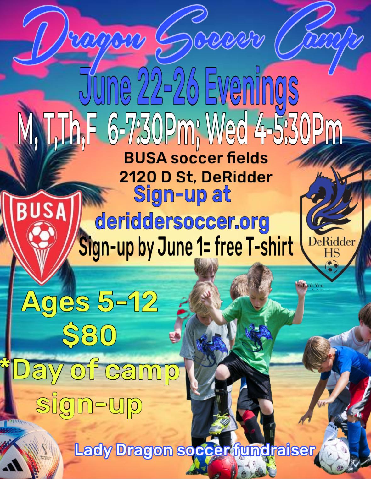 Lady Dragon Soccer Camp Fundraiser for boys & girls Ages 5-12 June 22-26; M, T. TH & F 6-7:30pm, Weds early 4-5:30pm at Beauregard Soccer Complex (BUSA game fields) 2120 D Street, DeRidder, $80, concessions available Sign up online at deriddersoccer.org or sign up at Camp