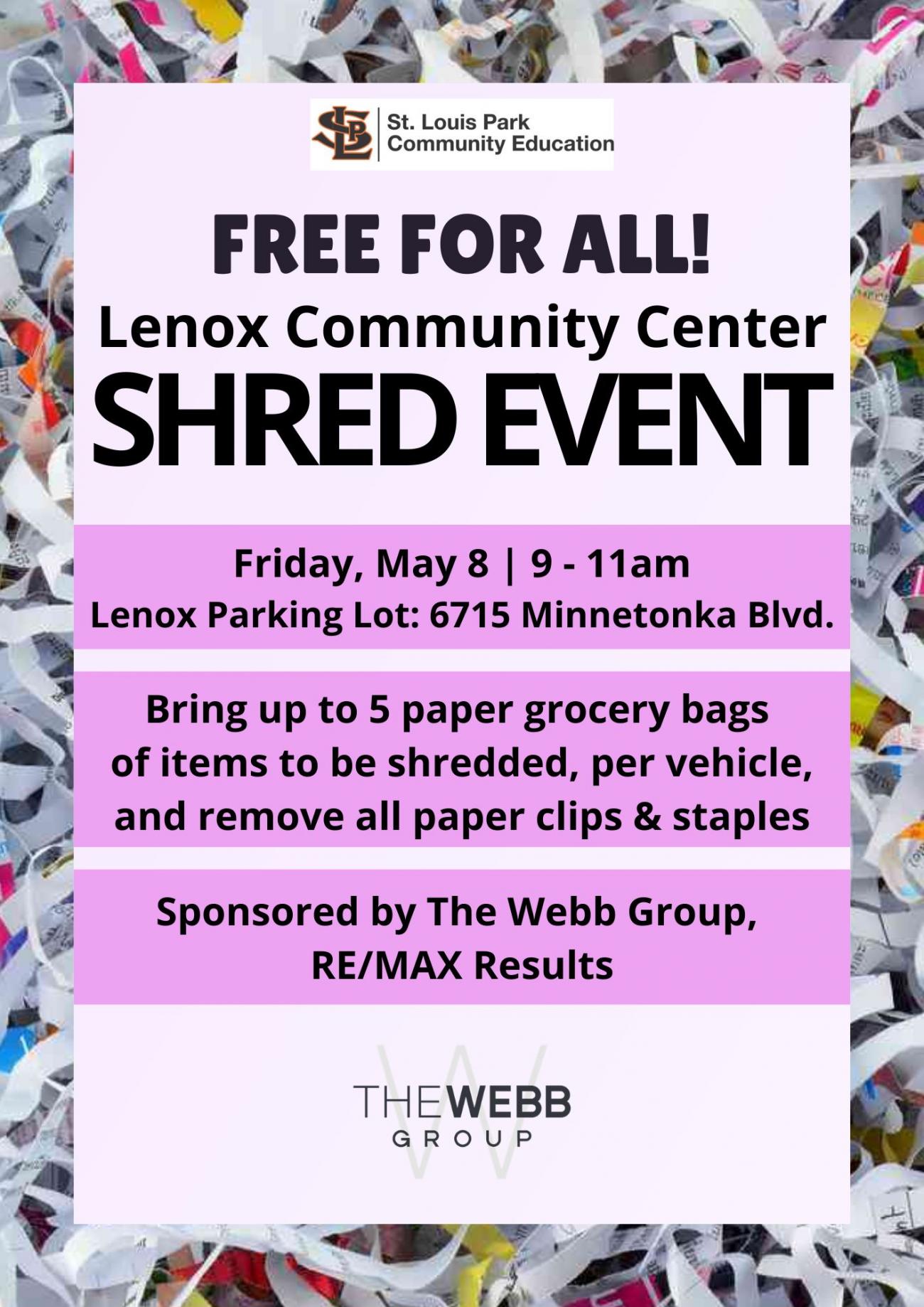 Hosted by St. Louis Park Community Education, join us for a free shredding event at Lenox Community Center! There will be volunteers to help you safely shred your important documents.