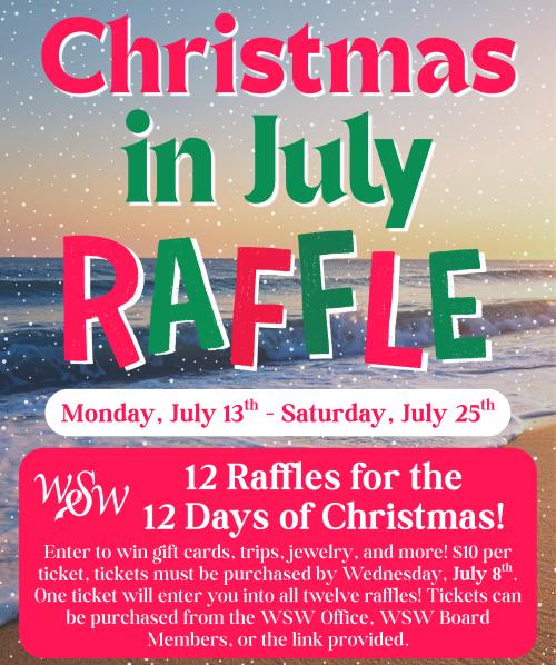 Purchase your ticket for a chance to win during WSW’s 12 Days of Christmas in July Raffle! Each ticket gives you one entry for 12 days of exciting prizes. Be sure to include your name, phone number, and email address on each ticket so we can contact you if you win.