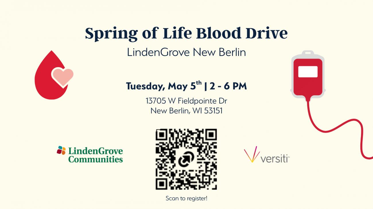Your time and blood can help save a life. If you’ve ever wanted to make a meaningful impact, join us at the LindenGrove New Berlin Spring of Life Blood Drive Tuesday, May 5th from 2 - 6 PM.