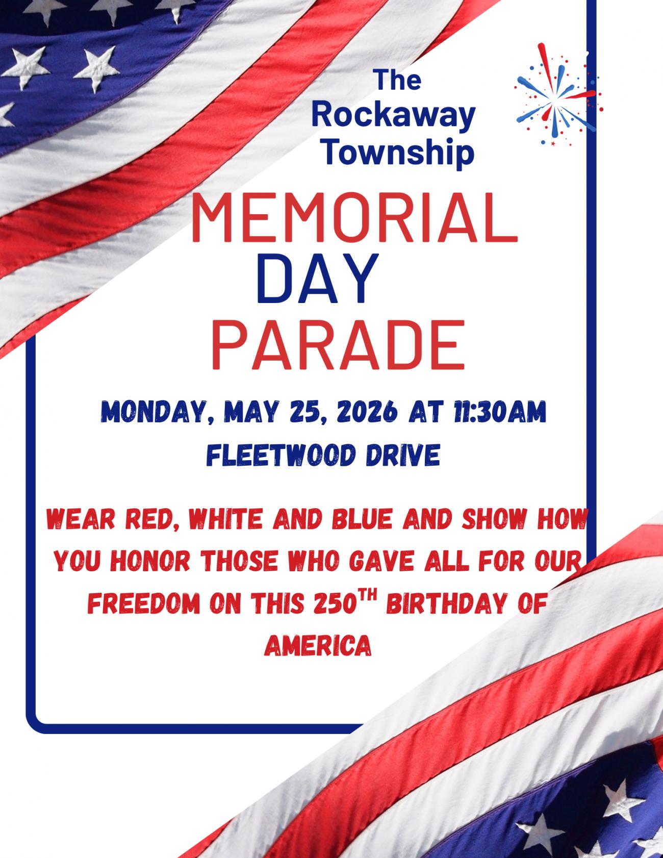 The Rockaway Township Memorial Day Parade at 11:30AM, Fleetwood Drive.