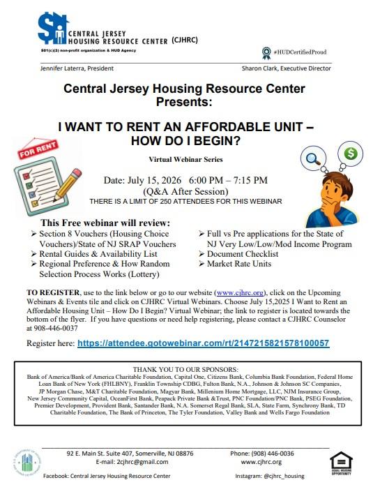 Learn about locating and applying for a home in the State of NJ Very Low/Low/ Moderate Income Program. This webinar details the documents needed to apply, the difference between completing a full application versus a pre application, regional preference, how the random selection process works (lottery), CJHRC’s rental guide and availability list and much more. To REGISTER, use to the link below or go to our website: Click for Details, click on the Upcoming Webinars & Events tile and click on CJHRC Virtual Webinars. Choose July 15,2025 I Want to Rent an Affordable Housing Unit – How Do I Begin? Webinar; the link to register is located towards the bottom of the flyer. If you have questions or need help registering, please contact a CJHRC Counselor at 908-446-0037