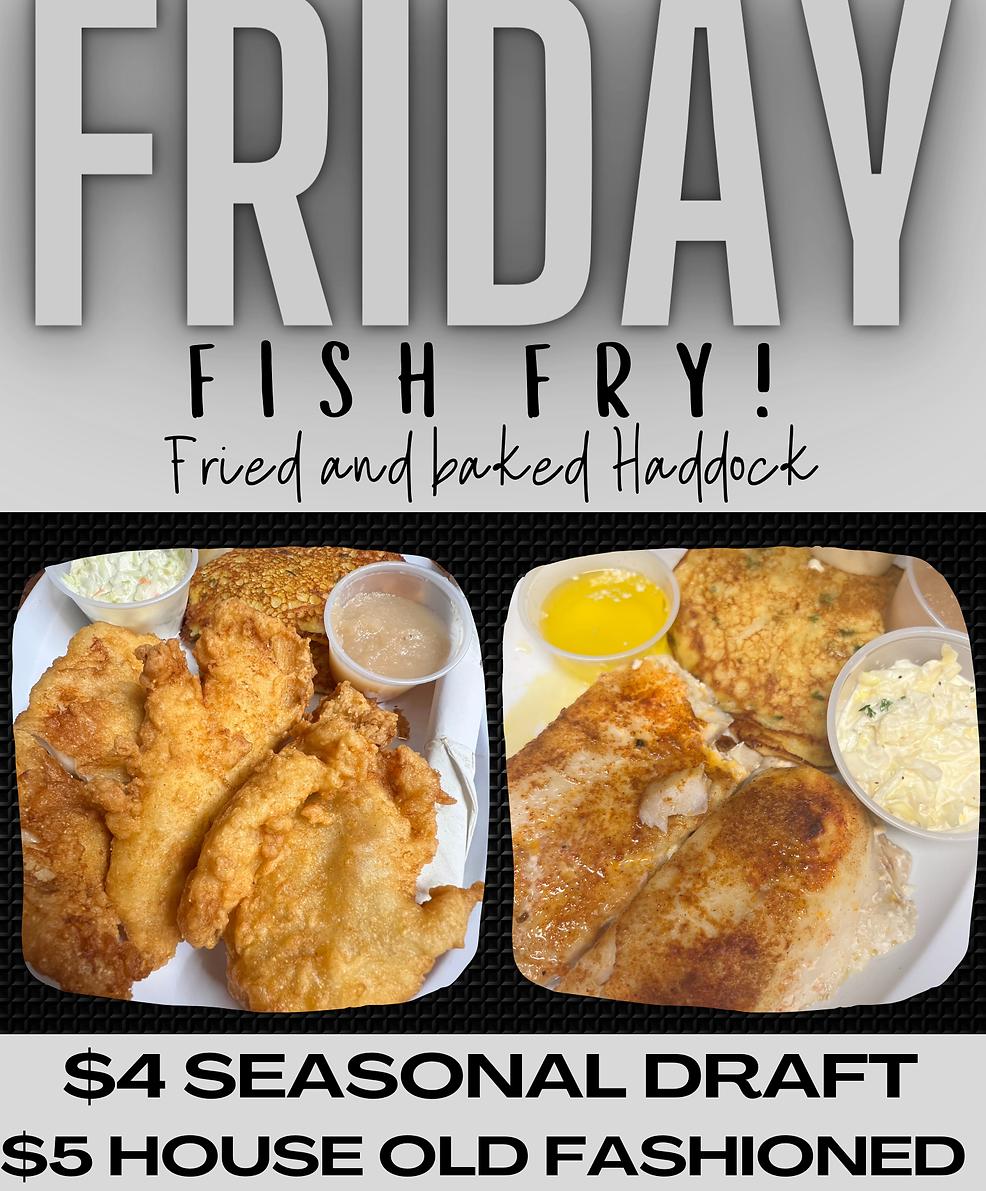 Beer battered haddock, lettuce, tomatoes, tartar sauce, and Anerican cheese, served on a bakery bun.