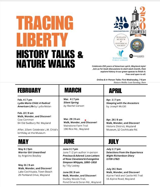 The Museum is excited to launch Tracing Liberty: History Talks & Nature Walks with the Town of Wayland. Celebrating 250 years of American spirit, this series uses book discussions (Zoom for those further afield and in-person for locals) on the first Wednesday of each month followed by an end of month (last Sunday) walk to explore history in our many green spaces. We will have a scavenger hunt for little kids to join in on the walks, and while the books are geared towards adults/young adults, walks will be family friendly. Free and open to all.