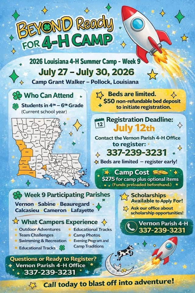 Vernon Parish 4-H invites 4th–6th grade students to an exciting week of outdoor adventure, leadership activities, and new friendships at 4-H Summer Camp, July 27–30, 2026 at Camp Grant Walker in Pollock, LA. Camp cost is $275 with a $50 non-refundable bed deposit required to begin registration. Scholarships are available. Spots are limited. Call 337-239-3231 to register.