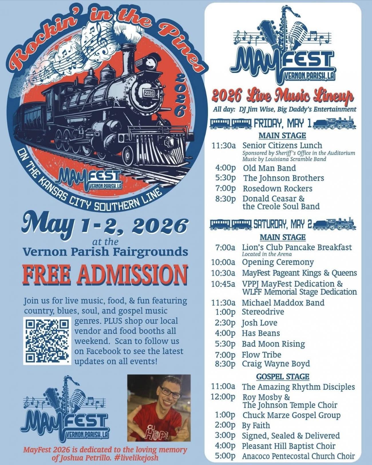 Join the community for MayFest 2026 at the Vernon Parish Fairgrounds for two days of music, food, and family fun. Enjoy live performances across multiple stages featuring country, blues, soul, gospel, and more, along with local vendors, food booths, and activities for all ages.