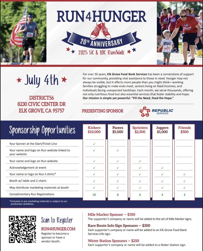 Mark your calendars! The 2025 Run 4 Hunger is set for Friday, July 4, 2025, celebrating 20 years of running, walking, and giving back to the Elk Grove community. This milestone event brings together families, friends, and neighbors for a morning of fun, fitness, and philanthropy—all in support of the Elk Grove Food Bank Services.