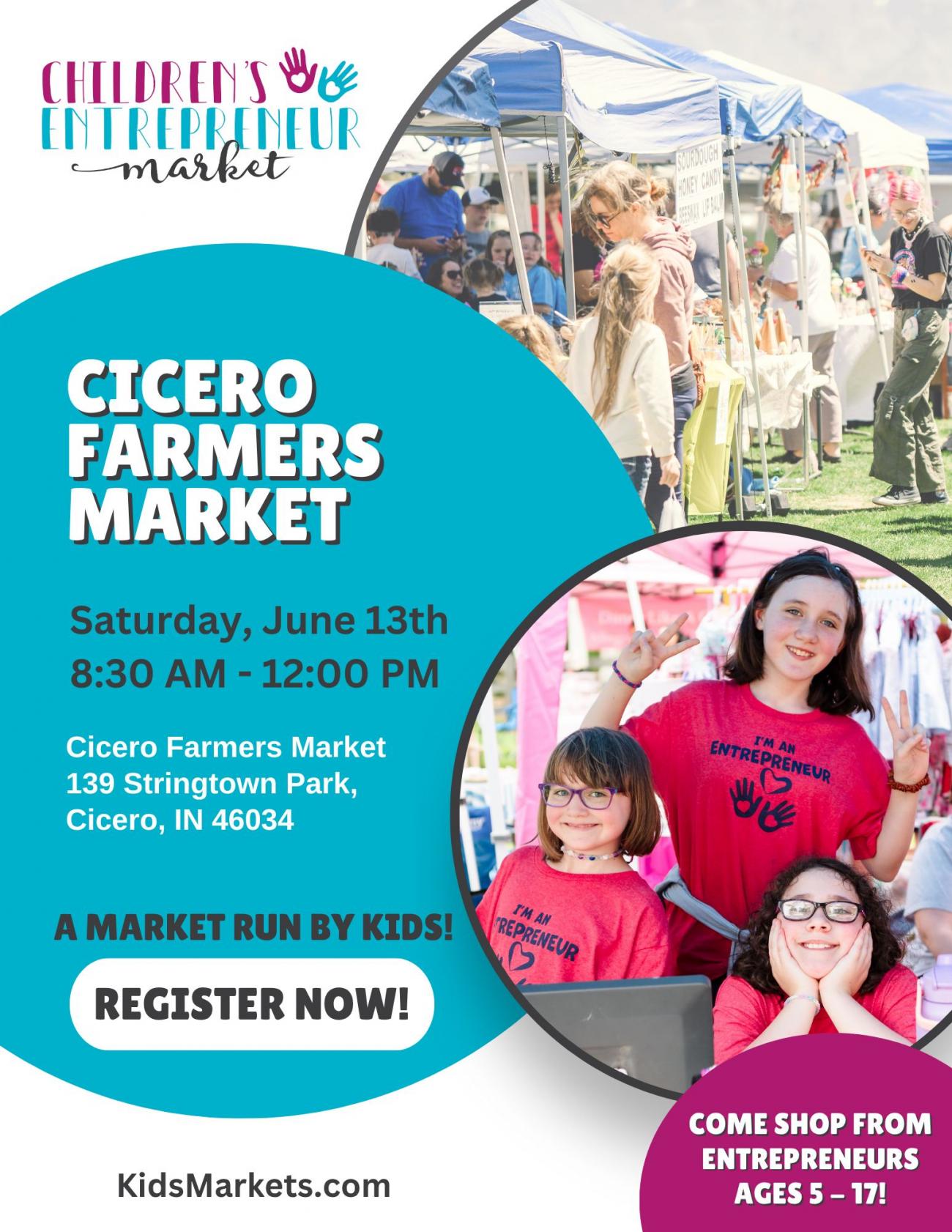 The kids market will be at the Cicero Farmers Market! Youth entrepreneurs can sign up at Click for Details to register to host their own booth.