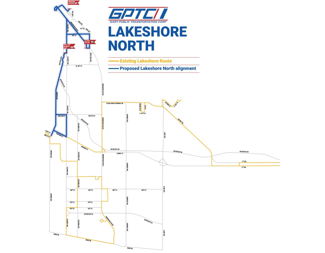 GPTC is proposing a new Lakeshore North route, extending from the current Lakeshore South to expand service to north Hammond and Whiting, providing connections from downtown Hammond to The Pavilion at Wolf Lake Memorial Park, Horseshoe Casino, and Calumet College of St. Joseph. This proposed change would also expand GPTC’s Access219 paratransit service area.
