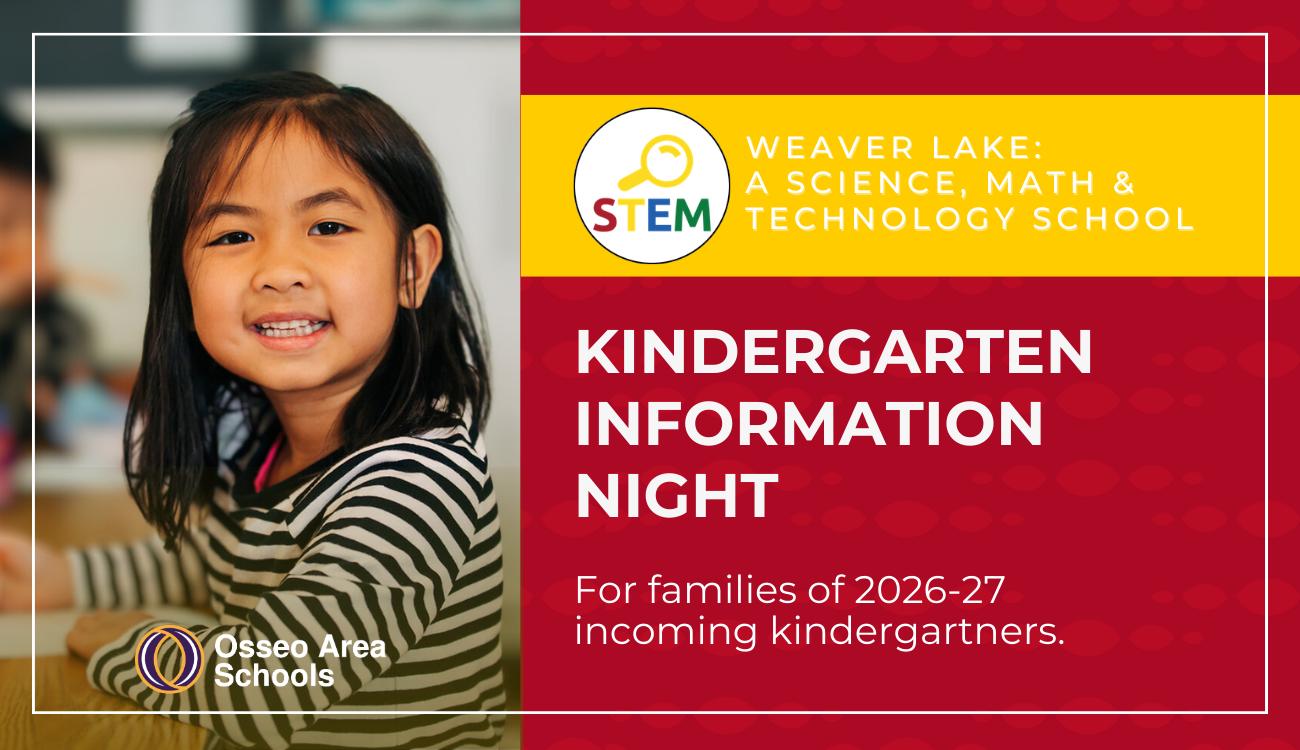 May 14, 2026 from 5-6:30 p.m. Explore what kindergarten looks like at Weaver Lake: A Science, Math & Technology School. Designed for families of 2026–27 incoming kindergartners, this event offers a welcoming introduction to the school community. Meet teachers and school leaders, step inside classrooms and learn about daily routines, curriculum and student experiences. Whether new to Osseo Area Schools or already enrolled, families will leave with helpful information and a better understanding of what to expect in kindergarten.