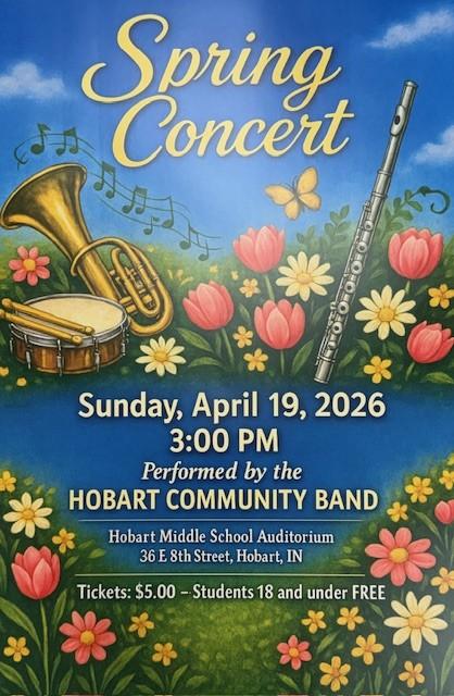 The SPRING CONCERT will be held on Sunday, April 19, 2026, at 3:00 PM at Hobart Middle School located at 36 E. 8th St, Hobart, IN 46342. Please enter through Door 5. If you need an accessible entrance without stairs, you can enter Door 9. The cost of admission is $5.00. Children 18 and under are admitted free. Following the concert, light refreshments and water will be served in the auditorium lobby. Please join us!